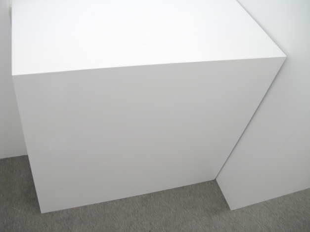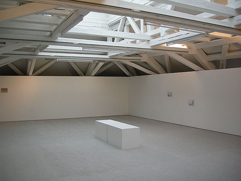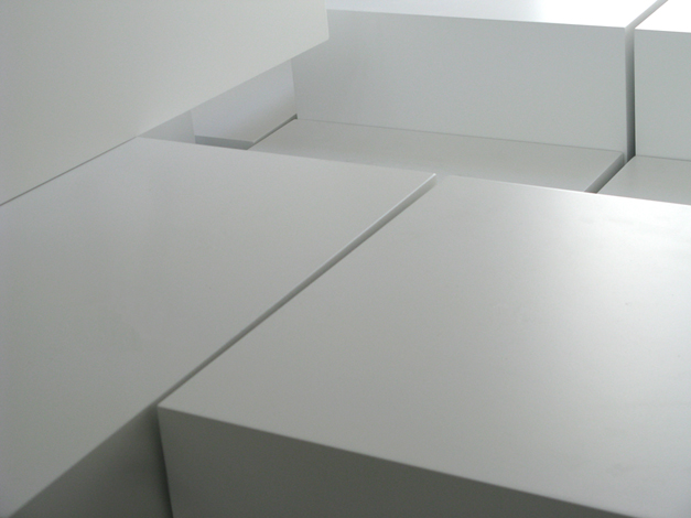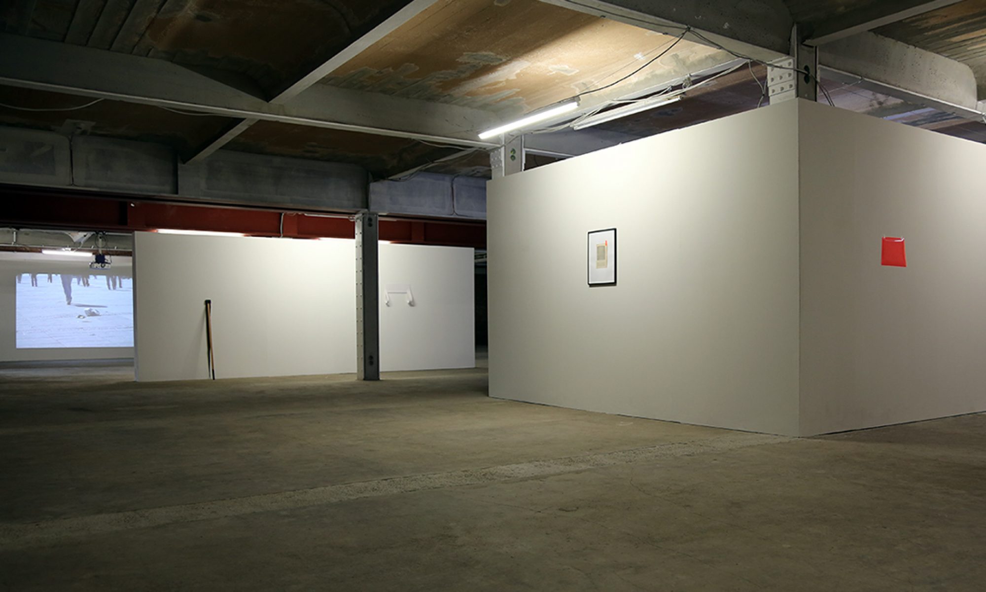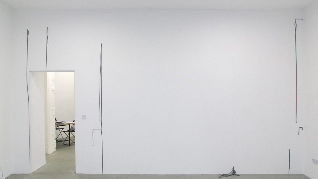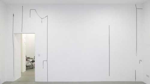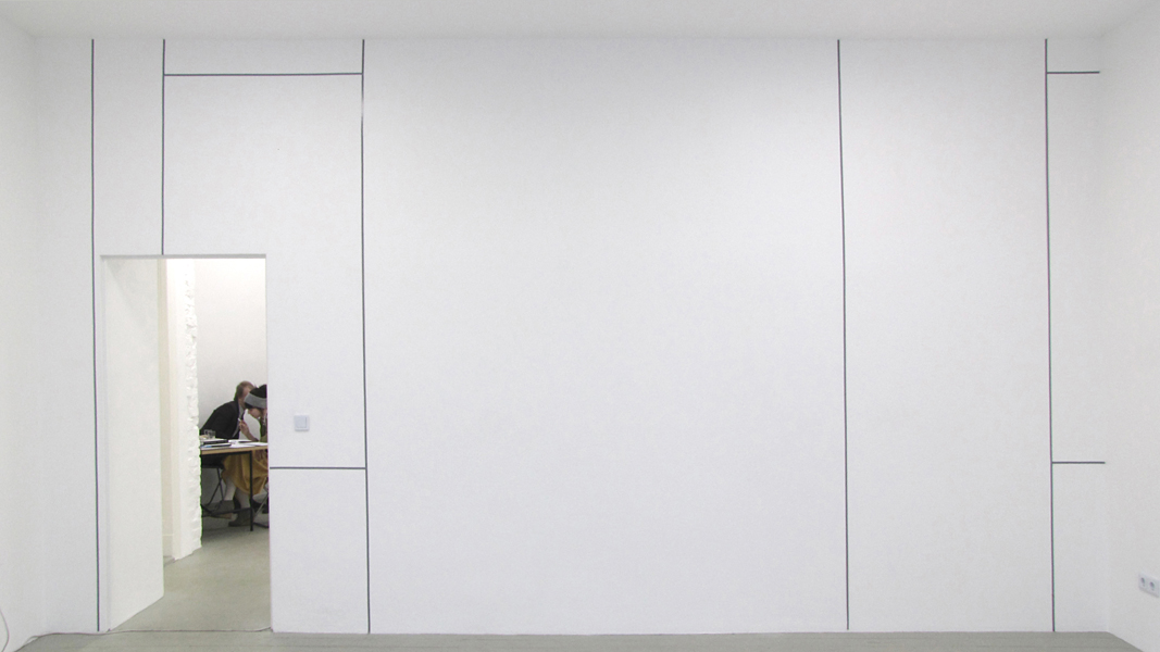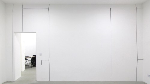 En el muro divisorio de los dos espacios que conforman la galería realicé en una de sus caras un dibujo técnico en escala 1:1 del espacio arquitectónico situado detrás del muro. El material empleado para este propósito fue una cinta adhesiva de PVC gris que por su condición elástica fue fijada con clavos a la pared para impedir su contracción.