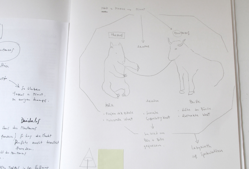 En la simbología de la bolsa de comercio el Toro representa el acenso de los valores de las acciones (es decir el Minotauro, quien recauda los impuestos de paz). El Oso representa por el contrario, la caída de las acciones (en nuestro caso Teseo, el vengador del pueblo y vencedor del Minotauro). Ariadna a su vez simboliza la justicia social. Al ver esta que Teseo tarda demasiado en salir, desata el hilo y entra al laberinto siguiéndolo. Al llegar al centro del mismo sorprende al Minotauro y a Teseo murmurando y riendo cómplices. Estos no tardan de comprender lo delicado de la situación y deciden matar y devorar a Ariadna y divulgan la creencia de que Artemisa fue quien la asesino. Teseo y Minotauro (Oso y Toro) comparten ahora el hilo de Ariadna y juran seguir el combate por el resto de la eternidad.