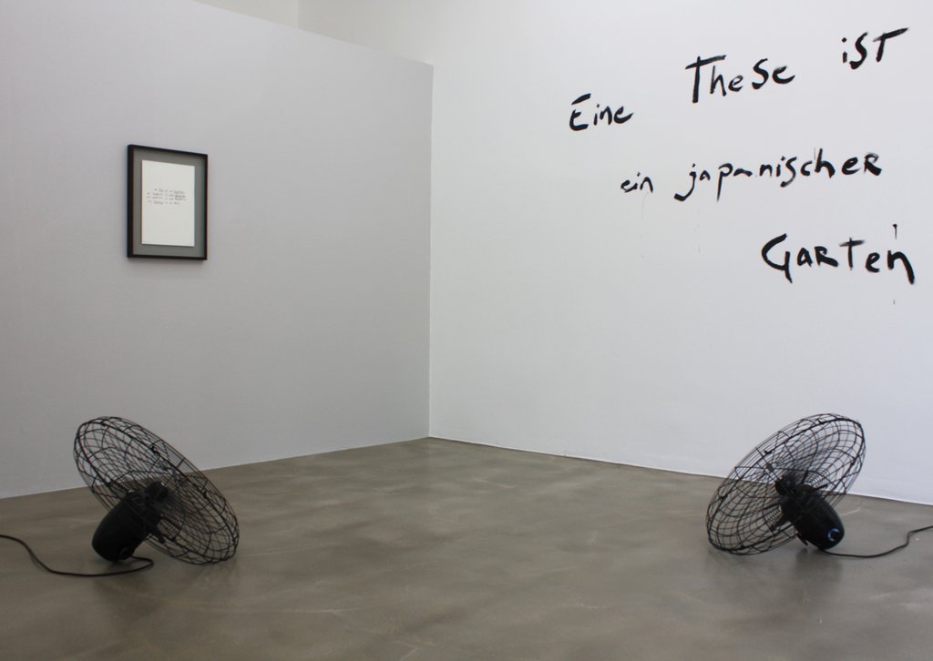 A thesis is a Japanese Garden (Eine These ist ein japanischer Garden) says the writing on the opposite wall. It would actually be a relief to think that we can bring our walk through the garden to a memorable ending, the hill that offers us the harmonious view of our thoughts and actions. And we might need indeed a breath into this fragile (or solid sometimes) phantasy before going down back to the garden. This closeness and return to the material is a recurrent question in Asef’s work. Be it a brick, a cake, debris, a lottery poster or the ink of words on the page, the materiality of thought is always perceived. Thus, there is never a two-dimensional experience, space, even in a small caress of volume is present. And this is especially striking in his statements, where language thinks (as it happens with the aphorism) within a very small margin of space and through very few elements. But the weight of the word on the white page (which could turn this kind of writing into visual poetry or slogans) is too much, it unbalances sensitivity. And there is where the line appears. It is never a decoration, and its relation to the words is not clearly stated. But it seems to have the function of bringing back language a little closer to its materiality, even to remind this inked decisions that there is a void around them. Casual, programatic, or even ironic or playful sometimes, the lines that appear in Asef’s work create a relational tension that incorporates language but also goes beyond it. Those lines need to be handled with care, and cannot always be trusted. So the best thing we can do is to approach the ear, the eye, and ask them what are they thinking in there. For there will be no better clue to understand and enjoy the unbalanced garden they are part of.