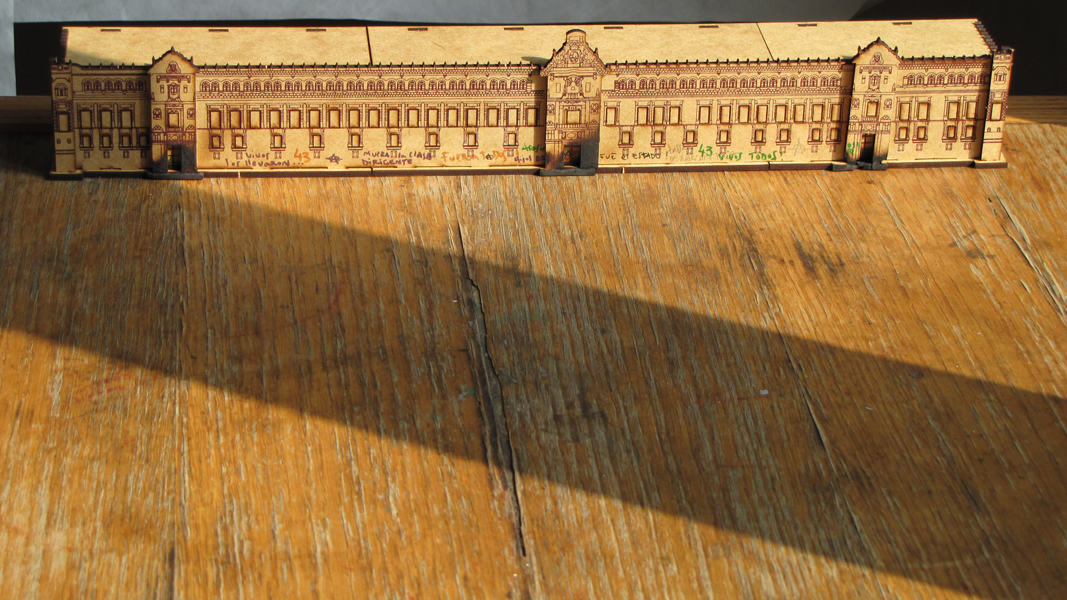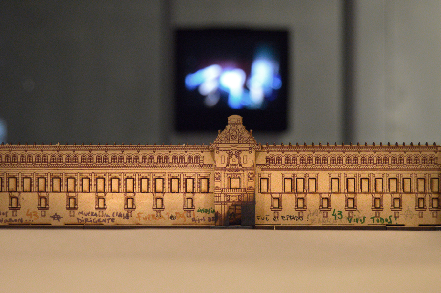 The work 8 de Noviembre consists of two video projections and a table “adorned” with diagrams, on top of which is situated a model of the National Government Palace with burned gates. The first video shows television footage of the incident on November 8, 2014. On the opposite side of the gallery a second video projection shows a group of restorers at work on the facade of the National Government Palace.