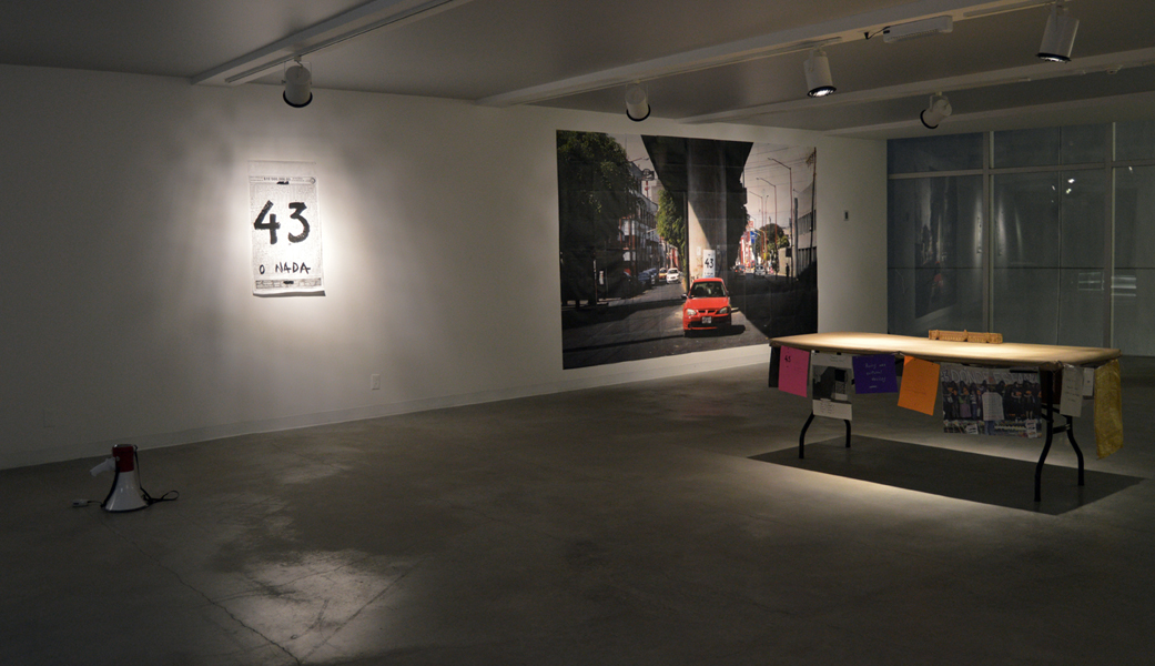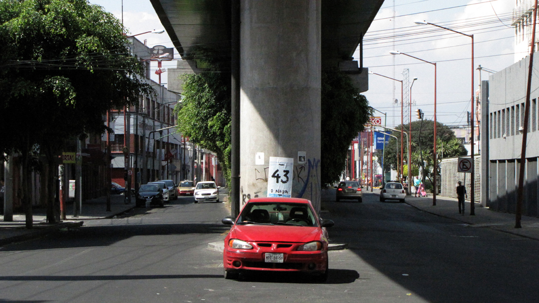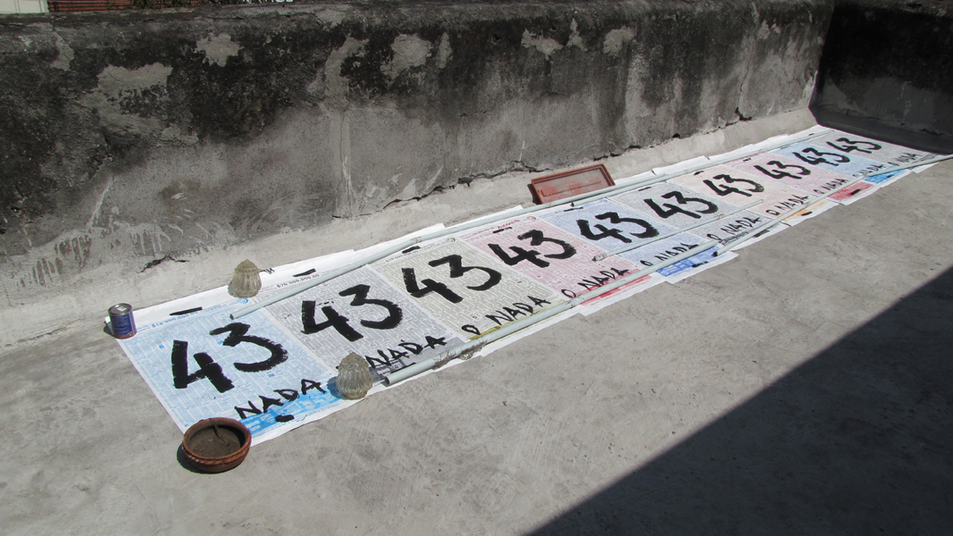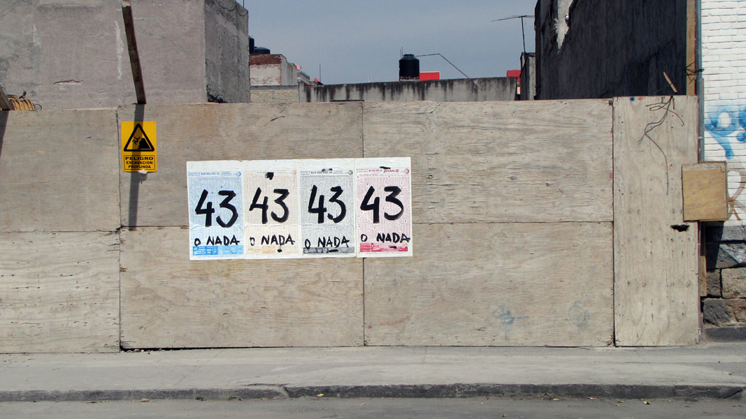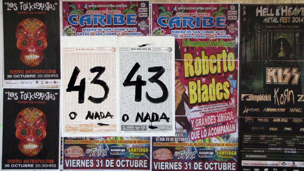 The phrase “43 or nothing” was drawn on forty-three pages of the Mexican National Lottery’s infobooklet. These were installed in public space along the Colonia Santa Maria La Ribera during nighttime placarding actions on November 1-2, 2014. In the lottery’s symbolism the number 43 is a metaphor for balcony, connected here to the meaning of the popular Mexican term balconear.