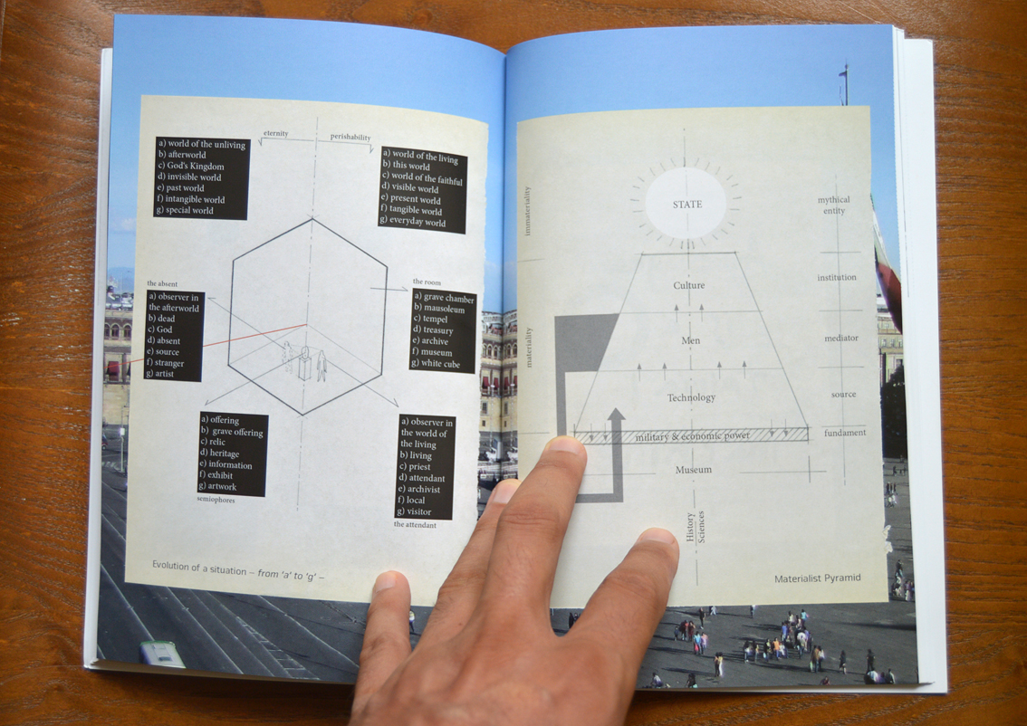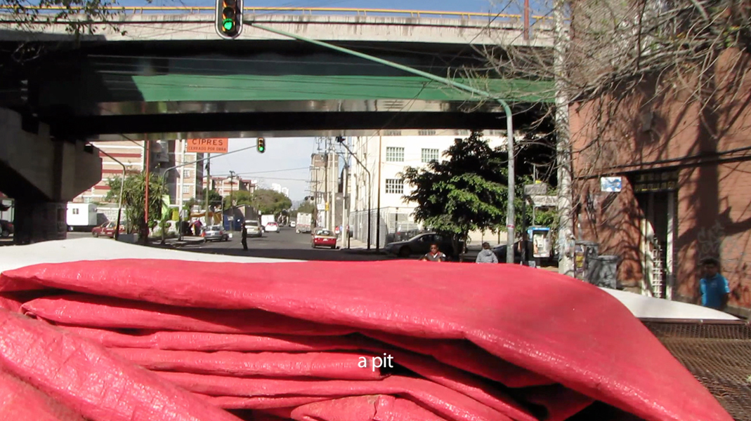 In the exhibition space at La Miscelanea University UNARTE, Puebla, Mexico, the three moments outlined above are presented concurrently in order to establish a formal and thematic dialogue between the works. The chanting of demonstrators from 8. November 2014 (in Video 1) serves as background for the organ music, which accompanies the restorers working on the facade of the National Government Palace (Video 2). Through a megaphone lying on the ground, the voice from Moment III, systematically repeats the listing of methodological actions associated with digging and excavating an object.