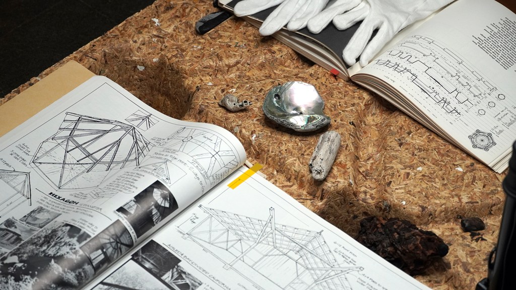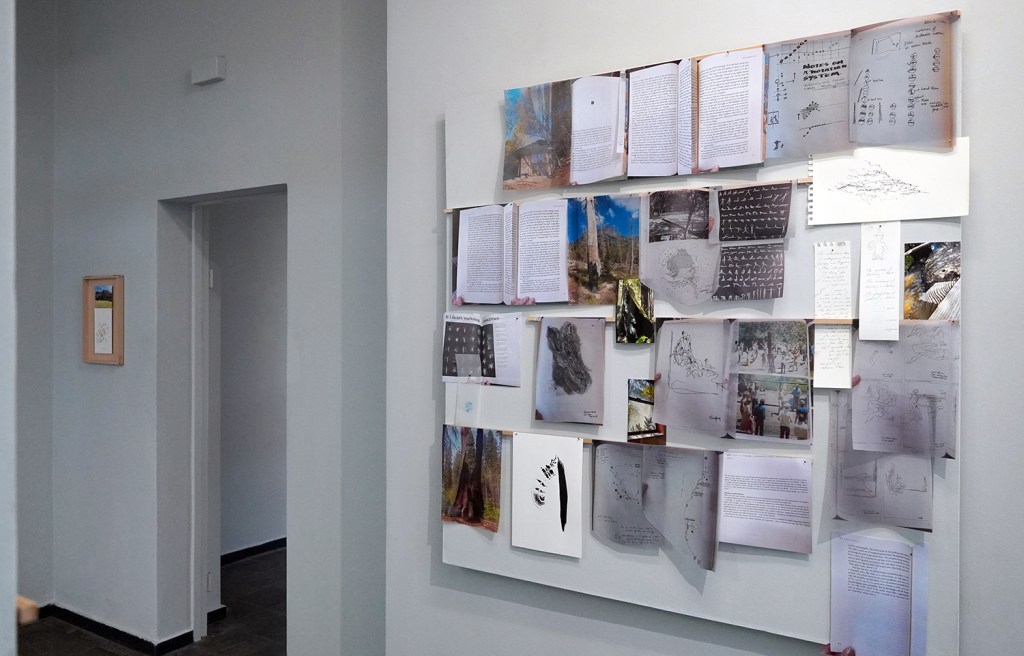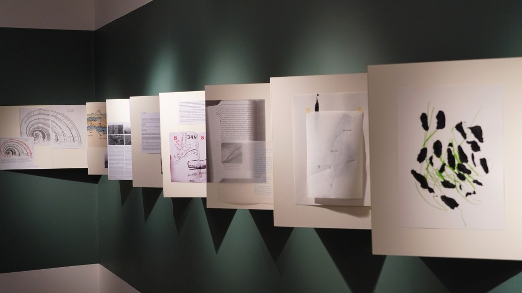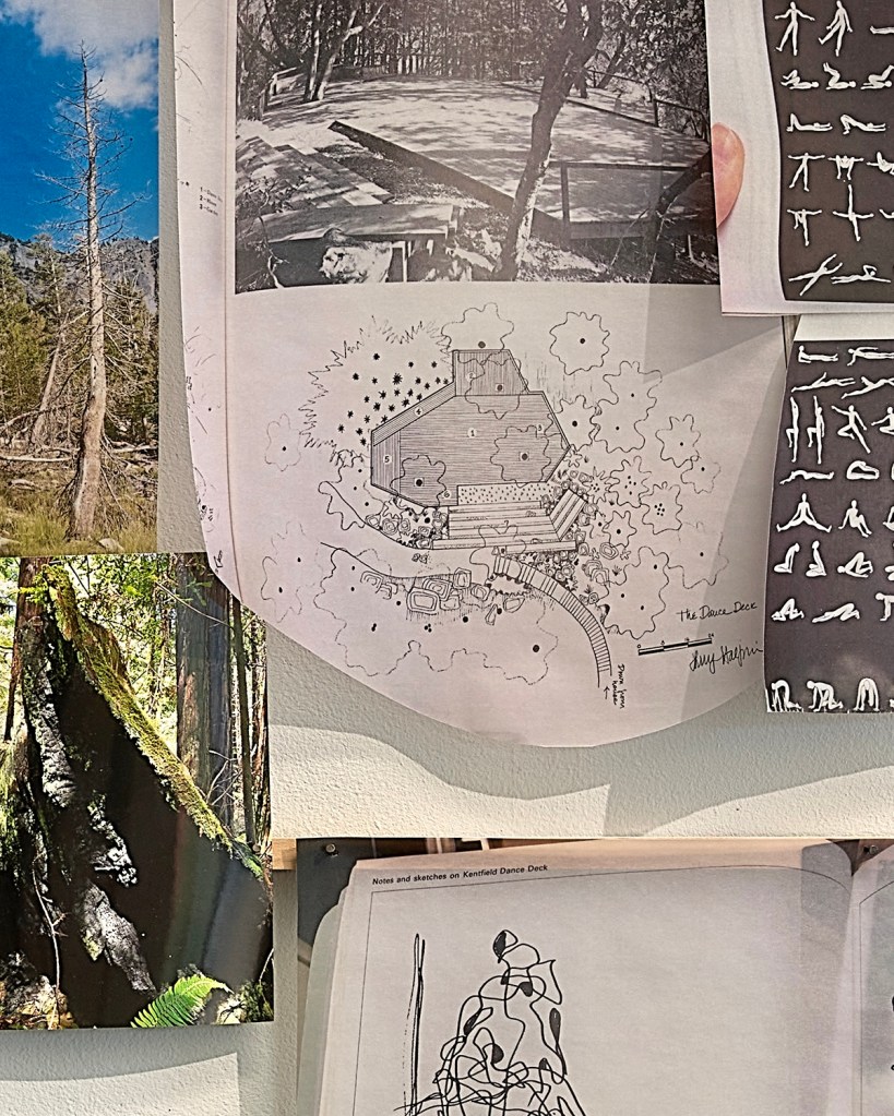 The archive consists of drawings, books, audios, and prints that offer insight into the artists‘ research and personal archives, probing and contextualizing the exhibition like a thread. The works come from two research trips to the historic site of “The Sea Ranch” in California. Built in the 1960s, the Sea Ranch continues to set international standards for the interplay between architecture and environment. This is also where the iconic choreographer Anna Halprin and her husband Lawrence, The Sea Ranch‘s landscape architect, worked together for community building. Yet, today it’s clearer than ever: It is a place where utopia and harsh social and ecological reality collide.