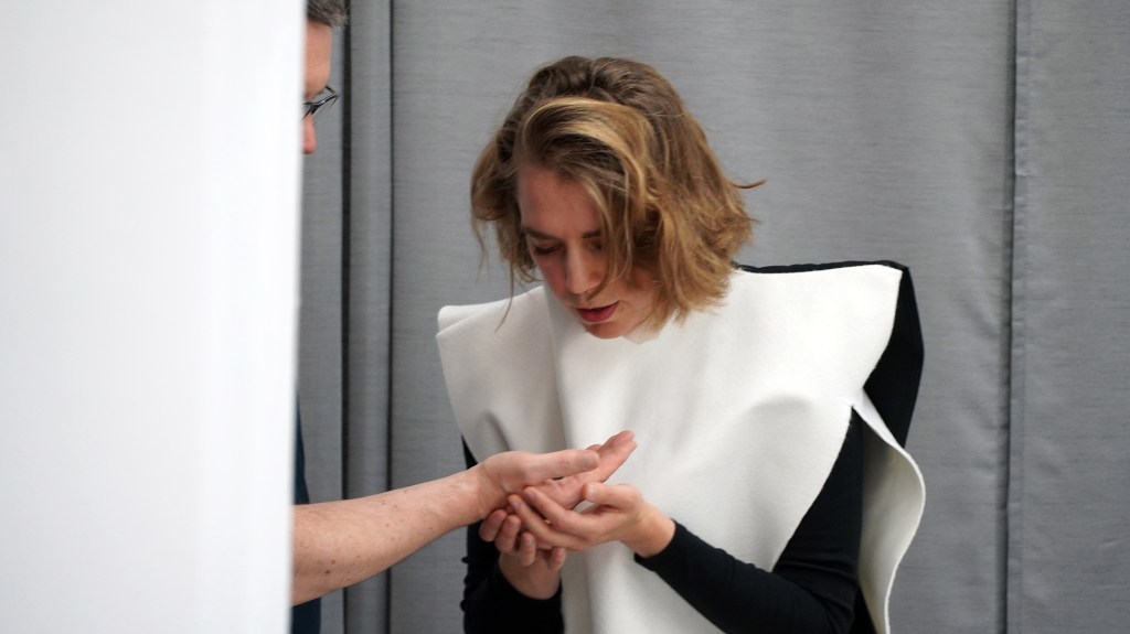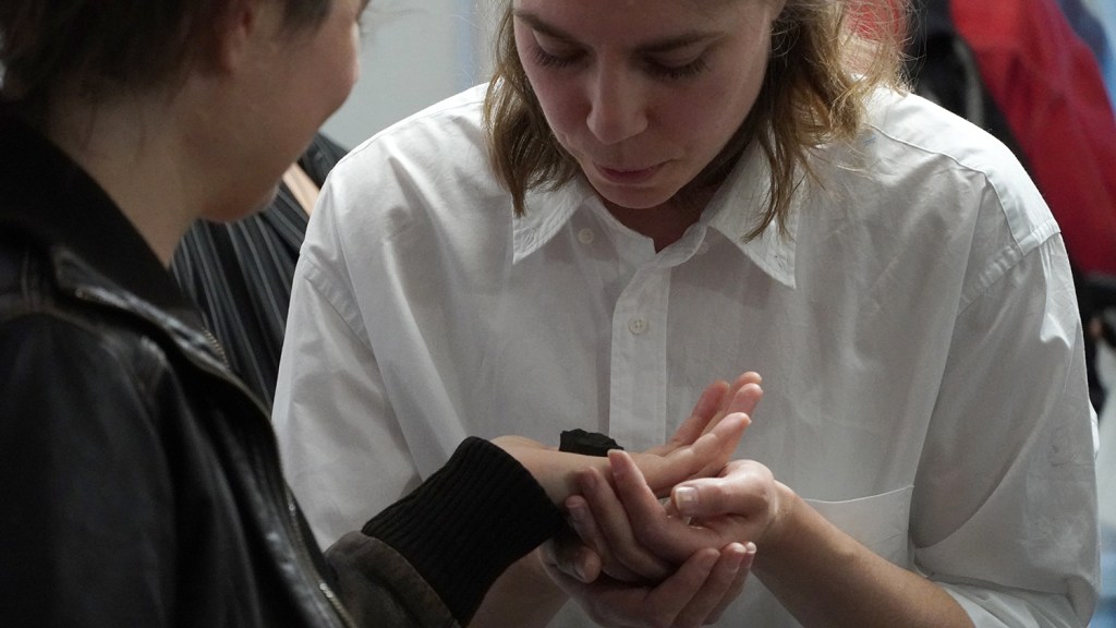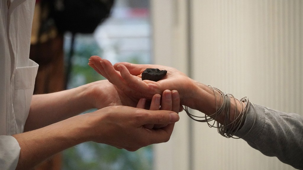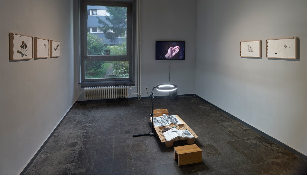 In the video performance “Hand-Charcoal-Song”, Burckhardt sings an impromptu song to and inspired by a piece of burnt wood while standing in the hollowed trunk of a burnt redwood tree – the largest and oldest trees on earth. They have gone nearly extinct due to logging, climate stress, and wildfires. Asef-Burckhardt have collected redwood charcoal pieces from wildfires to extend the video to a performative format, enabling a direct experience between charcoal, voice, and body: During the opening, she and the performer Mathilde Mensink sang into the hands of the visitors gently placing a charred redwood in their hands.