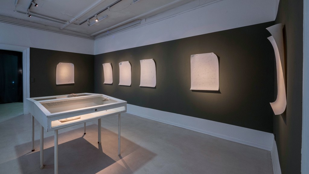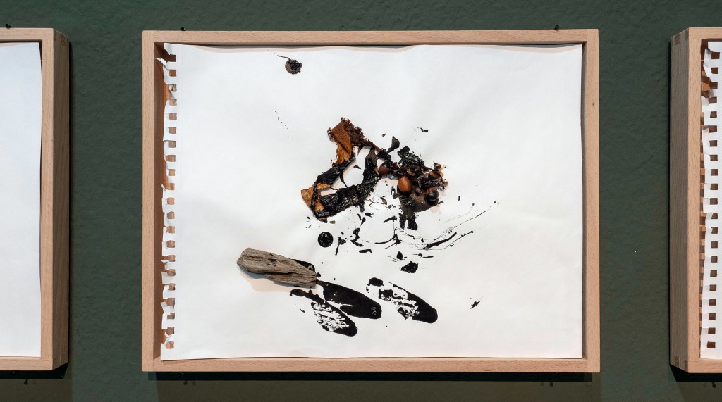 For their sound installation “In Between Before and After”, Asef-Burckhardt collected charred wood from sequoia forest fires. These charcoal pieces are set on a room-sized paper installation. Two transducer loudspeakers, attached to the paper, make the paper vibrate as a sound membrane, thereby causing the charcoal to tremble, creating dust and lines that draw traces of their conversation audible in the room. The spoken word emanating from the loudspeakers combines Asef-Burckhardt’s research and conversations, between dystopic and caring visions, asking: What could you write with a piece of burned Redwood charcoal that is not painful?