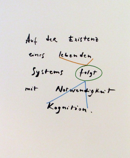 Los seres humanos somos seres racionales que utilizamos el lenguaje para interactuar con el mundo. Es decir que antes de poder establecer una relación con el mundo o con ‚el otro’ necesitamos describirlo, representarlo. De esta forma objetivisamos lo ajeno y lo hacemos a la vez propio para poder manipularlo, para establecer un dialogo, para incorporarnos al mundo. Pero según Maturana no estamos solos en este proceso, todo ser vivo requiere de descripciones para interactuar con su entorno. „Lebende Systeme sind kognitive Systeme, und Leben als Prozess ist ein Prozess der Kognition“3 y mas adelante „ Die Sprache ist die kognitive Bereich des Menschen“4