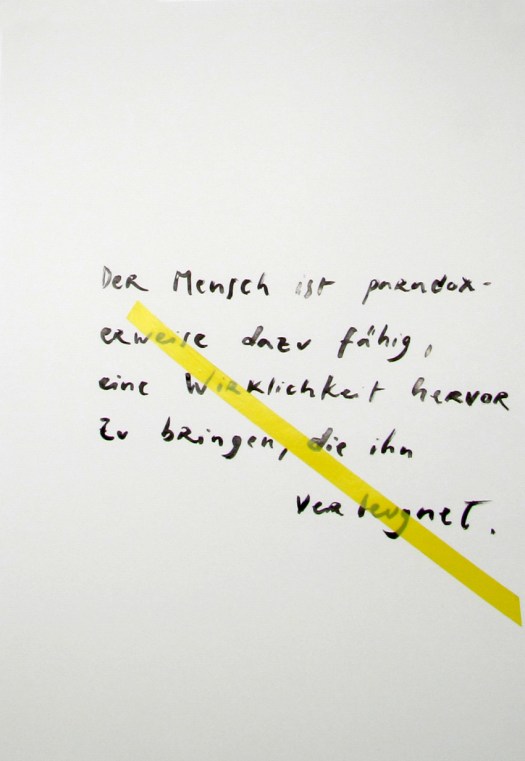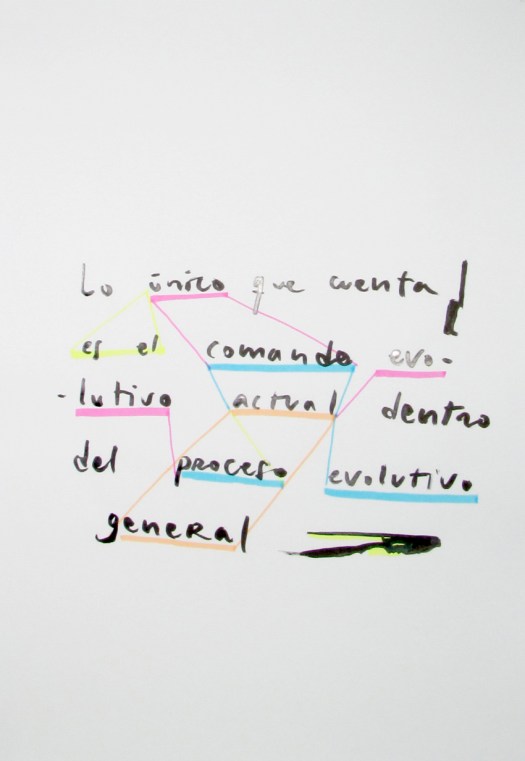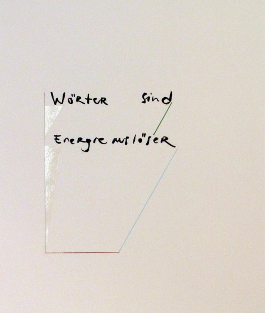 Entonces, qué sucede si en vez de escribir en y con medios convencionales se usan como medios objetos ya cargados de significado. El espacio arquitectónico mismo puede ser empleado como soporte y algún desecho industrial podría usarse como „lapiz“. El sonido que producen estos dos elementos al frotarse expresa su naturaleza física y la posición simbólica (e histórica, si se quiere) que ocupan en una cultura.